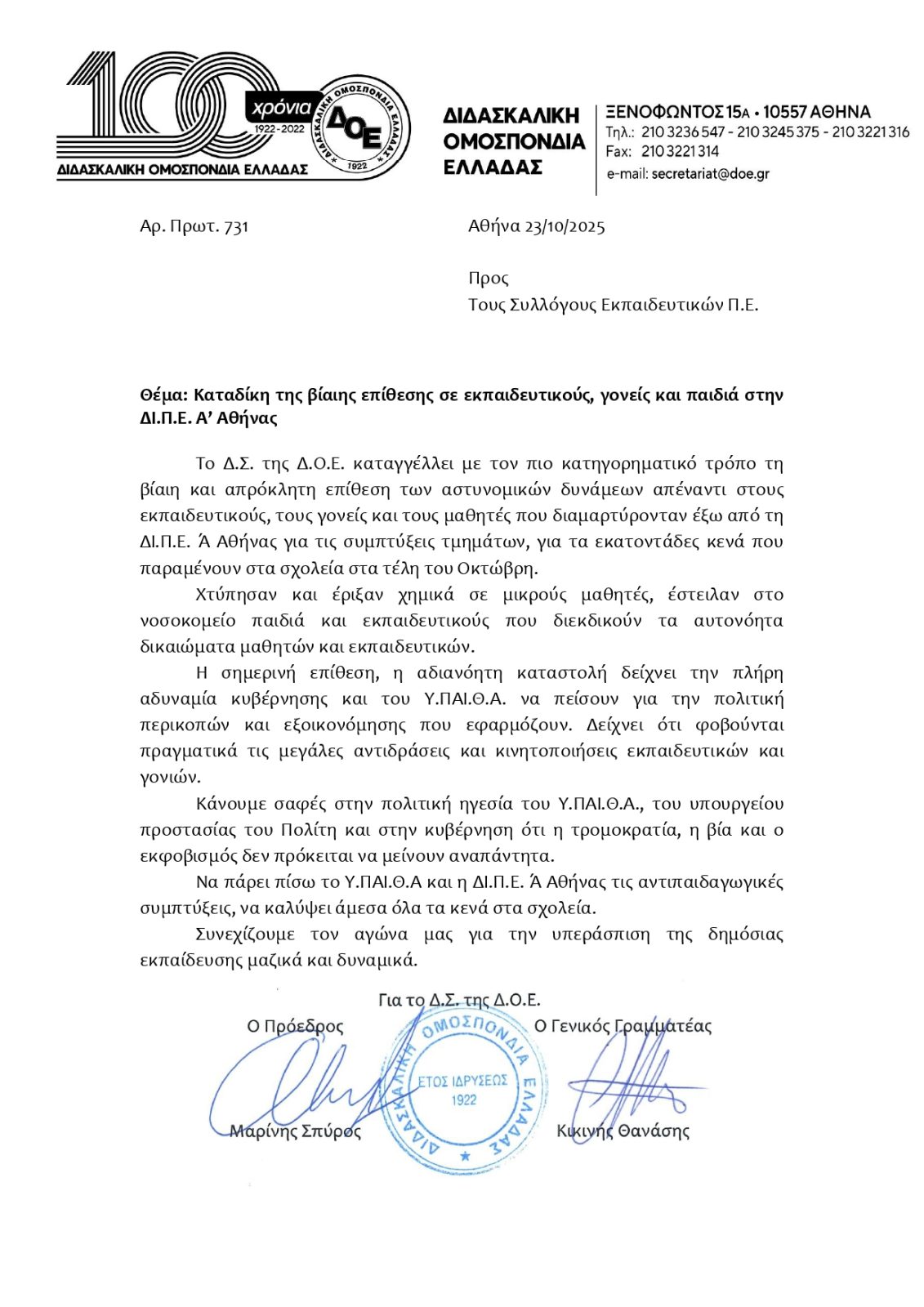 Την καταδίκη της «βίαιης και απρόκλητης επίθεσης των αστυνομικών δυνάμεων απέναντι στους εκπαιδευτικούς, τους γονείς και τους μαθητές» που διαμαρτύρονταν έξω από τη ΔΙ.Π.Ε. ‘Α Αθήνας εξέφρασε από την πλευρά της η Διδασκαλική Ομοσπονδία Ελλάδος.