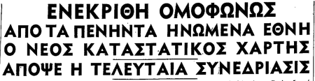 «Η οργάνωσις των Ηνωμένων Εθνών αποτελεί πραγματικότητα από χθες, οπότε ο υπουργός των Εξωτερικών των Ηνωμένων Πολιτειών κ. Μπέρνες υπέγραψε εις Ουάσιγκτον το έγγραφον της λήψεως των επικυρώσεων του καταστατικού Χάρτου. Επικυρώσεις εστάλησαν από 29 κράτη, μεταξύ των άλλων και της Ρωσίας. Διά της σοβιετικής αποφάσεως συνεπληρώθησαν αι επικυρώσεις των πέντε μεγάλων Δυνάμεων Ηνωμένων Πολιτειών, Αγγλίας, Γαλλίας, Κίνας και Σοβιετικής Ρωσίας, πράγμα το οποίον ήτο ουσιώδες προκειμένου να τεθεί εν ισχύ ο Καταστατικός Χάρτης.