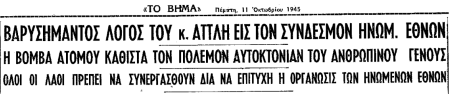 «ΤΟ ΒΗΜΑ» της 11ης Οκτωβρίου 1945 μεταφέρει την ομιλία του πρωθυπουργού της Μεγάλης Βρετανίας, Κλέμεντ Άττλι ο οποίος λίγες μόλις ημέρες πριν την ίδρυση του οργανισμού εκφράζει την αναγκαιότητα ύπαρξης του οργανισμού: