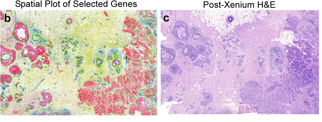 Ένα παράδειγμα για την εργαστηριακή τεχνική spatial transcriptomics: Βλέπουμε μια βιοψία ενός όγκου το μαστού (δεξιά) και στα αριστερά με διαφορετικά χρώματα βλέπομε ακριβώς ποια γονίδια μεταγράφονται στα κύτταρα αυτά. (πηγή: δημοσίευση)