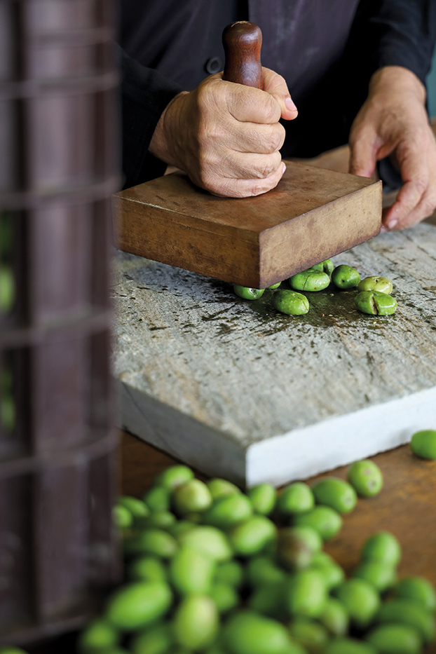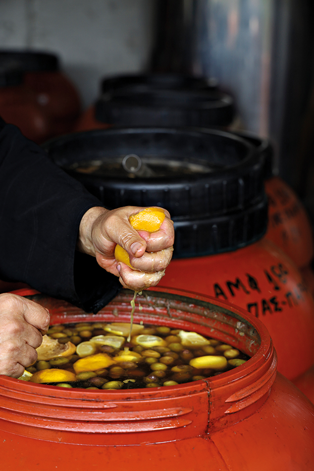 Οι επιτραπέζιες γίνονται άλλες τσακιστές και άλλες σχιστές ή και ολόκληρες. Φροντίζονται, μπαίνουν στα βαρέλια με αλάτι και λεμόνι, παίρνουν το χρόνο τους για να αναδείξουν την αληθινή τους γεύση. Οι θρούμπες κλείνονται σε τσουβάλια με αλάτι για τέσσερις μήνες, ενώ άλλες σε βαρέλια που κάθε εβδομάδα πρέπει να κουδουκλίζονται από τους μοναχούς, που κυλούν πέρα-δώθε τα σακιά, εξυπηρετώντας το πάστωμά τους.