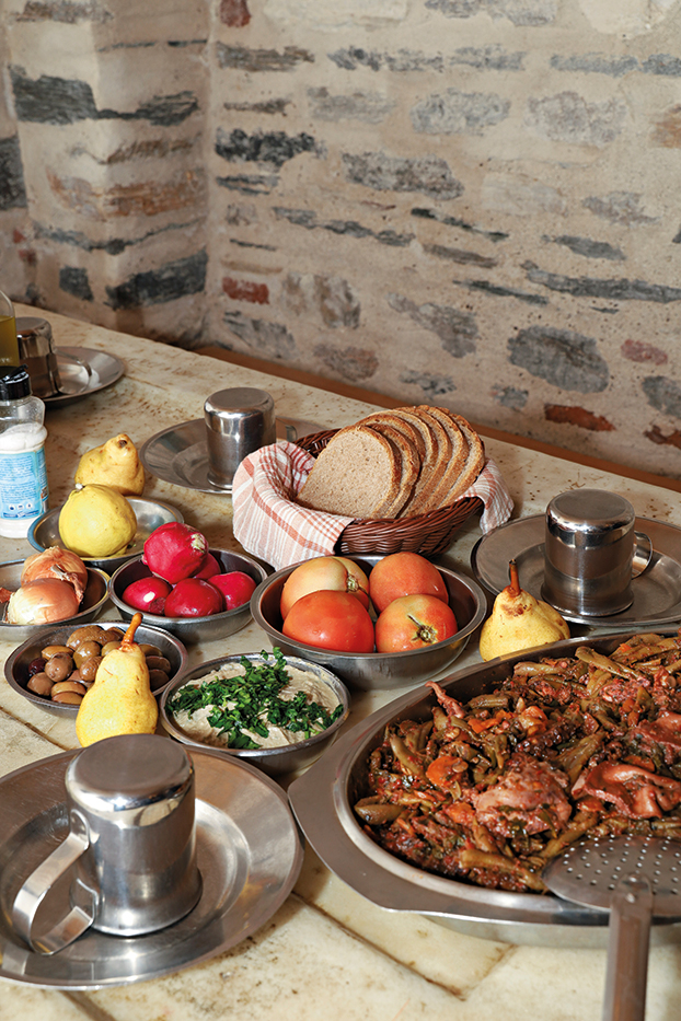 Οι Ακολουθίες στη μονή ξεκινούν στις 4 το ξημέρωμα με Όρθρο και Θεία Λειτουργία που ολοκληρώνεται στις 8 το πρωί. Τότε παρατίθεται το κυρίως γεύμα και όχι το πρωινό, όπως θα νόμιζε κάποιος. Ανάλογα με τη μέρα, οι μοναχοί θα έχουν στο τραπέζι κάποιο από τα αλάδωτα φαγητά, όπως φασολάδα ή φακές, ταχινοπατάτες και ελιές, ή κάποιο λαδερό, όπως το μπριάμ, το ρυζάκι με τα θαλασσινά, τα φασολάκια ή ακόμα και το ψάρι.