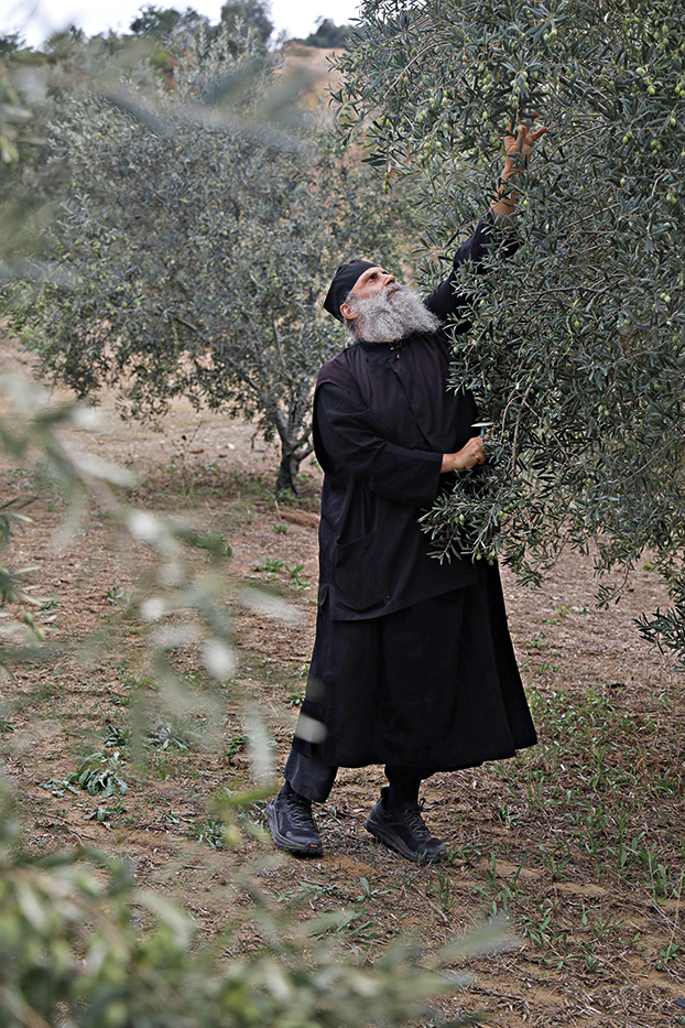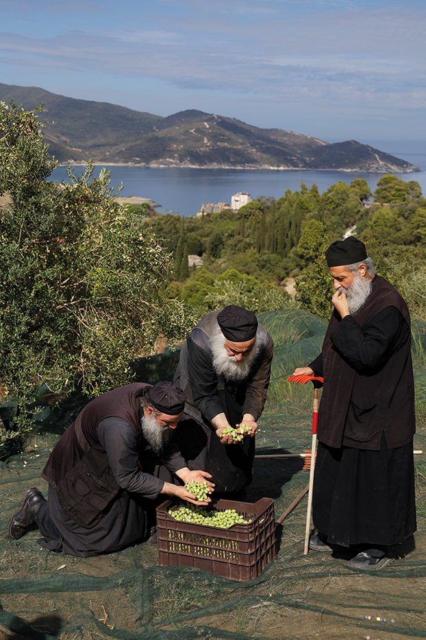 Ένα μελίσσι ακούραστο είναι η κοινωνία των μοναχών. Και στην επίπονη αλλά τόσο ουσιαστική διαδικασία της συγκομιδής και της επεξεργασίας της ελιάς, όλοι έχουν το ρόλο τους, διακονούν αρμονικά και με σύστημα, ακούραστοι, δεν αφήνουν το πόστο τους. Άλλοι μαζεύουν τον καρπό, άλλοι τον ξεχωρίζουν και άλλοι τον προωθούν είτε στο ελαιοτριβείο είτε στην επεξεργασία που απαιτείται για να γίνει βρώσιμος.