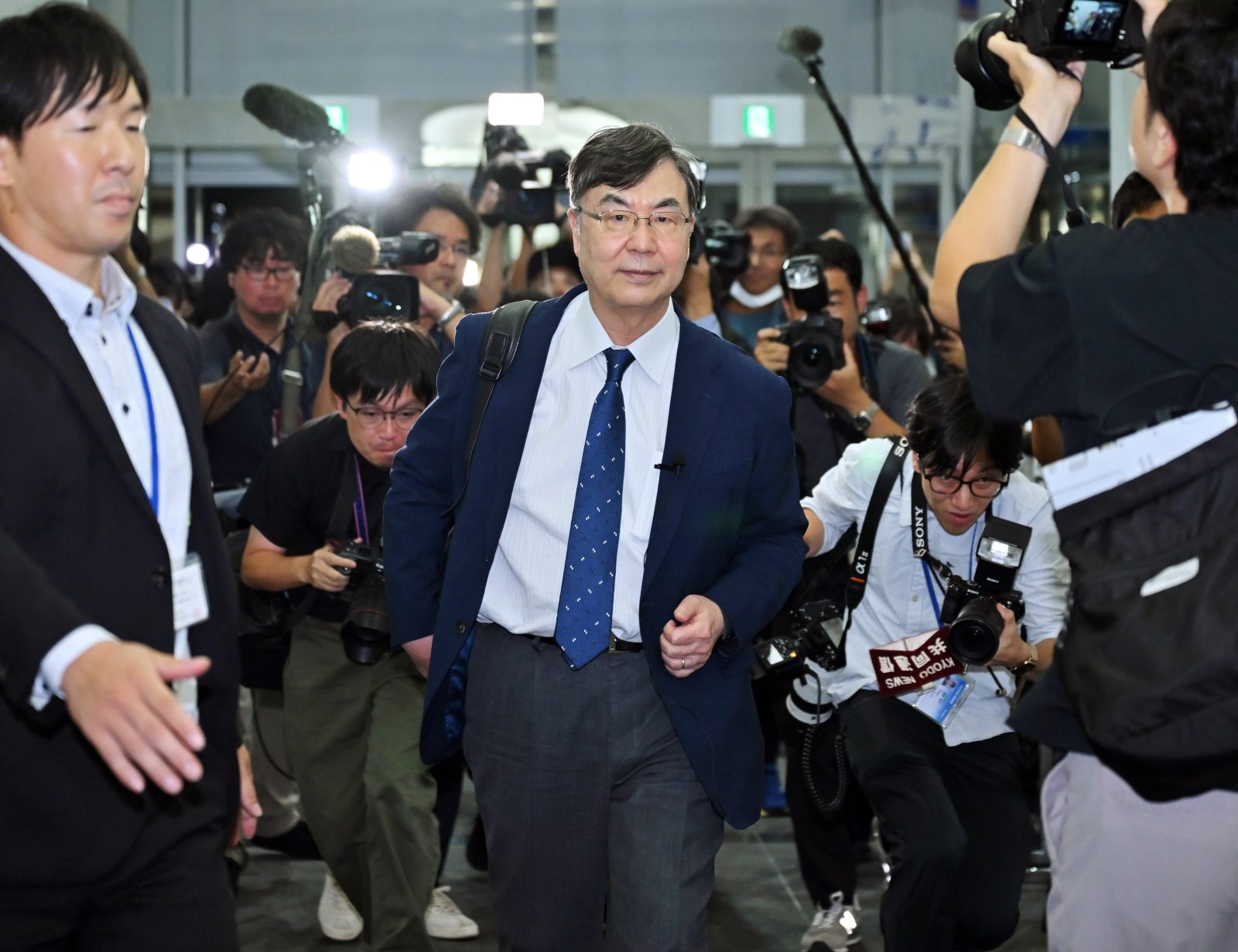 Ο Σίμον Σακαγκούτσι (στο κέντρο), ομότιμος καθηγητής του Πανεπιστημίου της Οσάκα, περιβάλλεται από δημοσιογράφους καθώς φτάνει σε συνέντευξη Τύπου, μετά τη βράβευσή του. EPA/JIJI PRESS JAPAN OUT