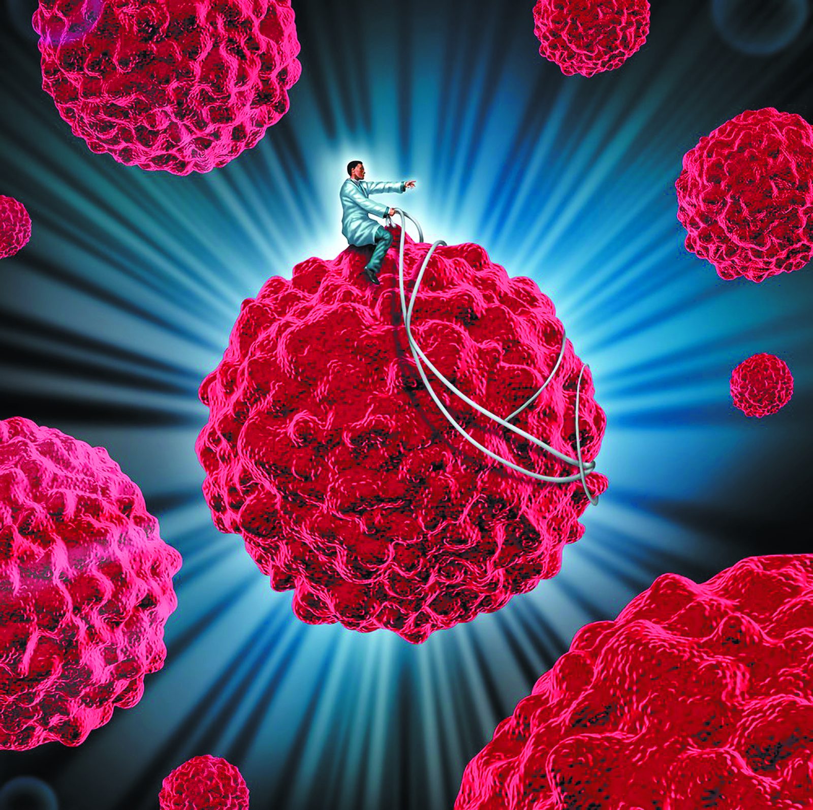 Ανίχνευση και έλεγχος καρκίνου ως μέθοδος διάγνωσης και αντιμετώπισης κακοήθων κυττάρων μέσω βιοψίας ή εξετάσεων, για περιπτώσεις που προκαλούνται από καρκινογόνες ουσίες ή γενετικούς παράγοντες. Εικονιστική απεικόνιση 3D καρκινικού κυττάρου ως σύμβολο της ανοσοθεραπείας.