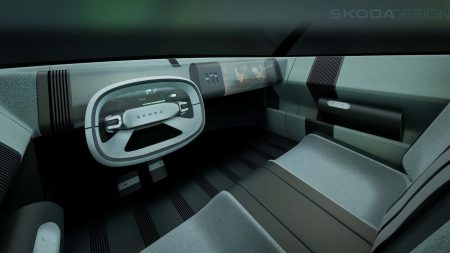 Στα ενδότερα η Skoda έχει επιλέξει μια μινιμαλιστική προσέγγιση με τον ρόλο του ταμπλό να αναλαμβάνει μια γυάλινη οβάλ κατασκευή όπου προβάλλονται όλα όσα μπορεί να επιθυμήσει κανείς σε επίπεδο ενημέρωσης ή ψυχαγωγίας. Το ενιαίο μπροστινό κάθισμα έχει καταργήσει εντελώς την κεντρική κονσόλα ενώ αυτό που απουσιάζει παντελώς είναι και το ελάχιστα φιλικό προς το περιβάλλον χρώμιο το οποίο «αντικαθίσταται» από τα γραφικά και τον ατμοσφαιρικό φωτισμό.