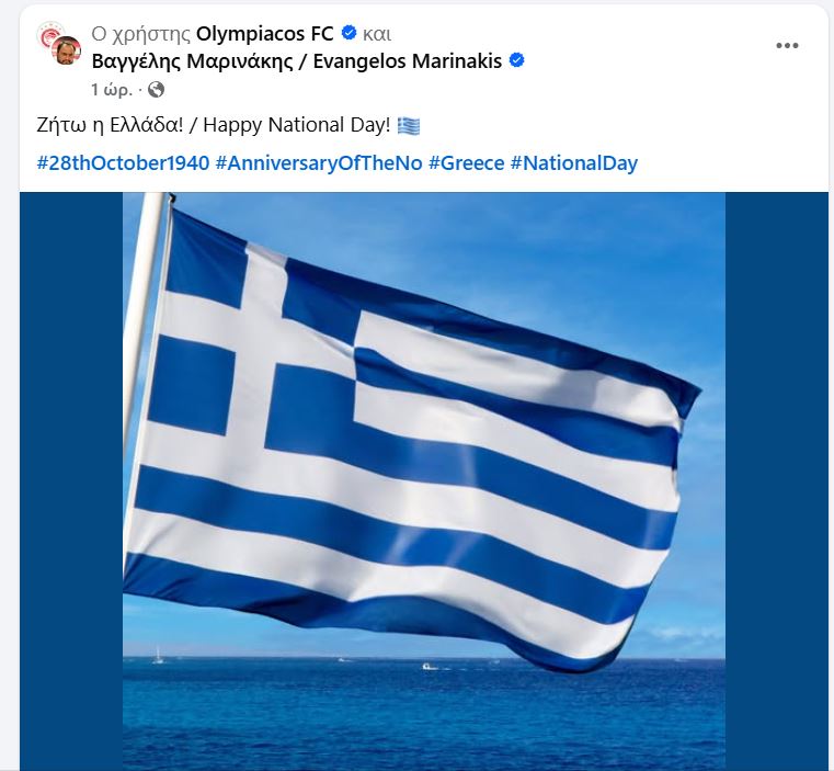 Με αφορμή, λοιπόν, τους εορτασμούς για την 28η Οκτωβρίου, η ΠΑΕ Ολυμπιακός και ο διοικητικός ηγέτης της, Βαγγέλης Μαρινάκης, έκαναν μια κοινή ανάρτηση θέλοντας να στείλουν το δικό τους μήνυμα.