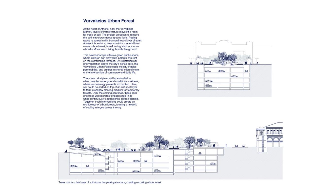 Varvakeios Urban Forest: Με τη δημιουργία πάρκου πάνω από το υφιστάμενο πάρκινγκ, μία «σκληρή» επιφάνεια μετατρέπεται σε «αστικό δάσος» με αποτέλεσμα τη διαμόρφωση δροσερού μικροκλίματος. Έτσι, διαμορφώνεται δημόσιος χώρος για παιχνίδι και ξεκούραση.