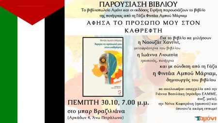 Το βιβλιοπωλείο Αμόνι και οι εκδόσεις Ειρήνη παρουσιάζουν το βιβλίο της ποιήτριας από τη Γάζα Φιντάα Αμπού Μάριαμ, «Άφησα το πρόσωπο μου στον καθρέφτη».