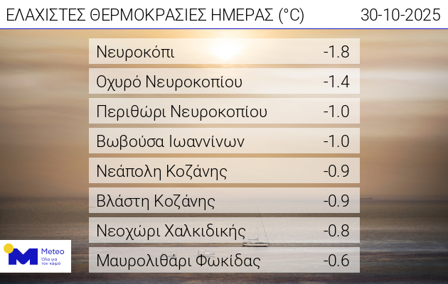 Στον πίνακα που ακολουθεί παρουσιάζονται οι 8 σταθμοί με τις χαμηλότερες ελάχιστες θερμοκρασίες μεταξύ των σταθμών του δικτύου του meteo.gr / Εθνικού Αστεροσκοπείου Αθηνών.