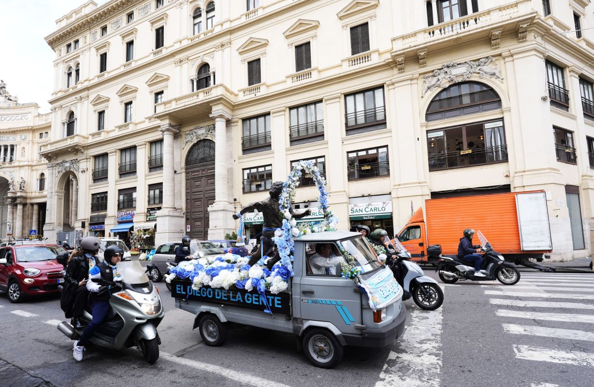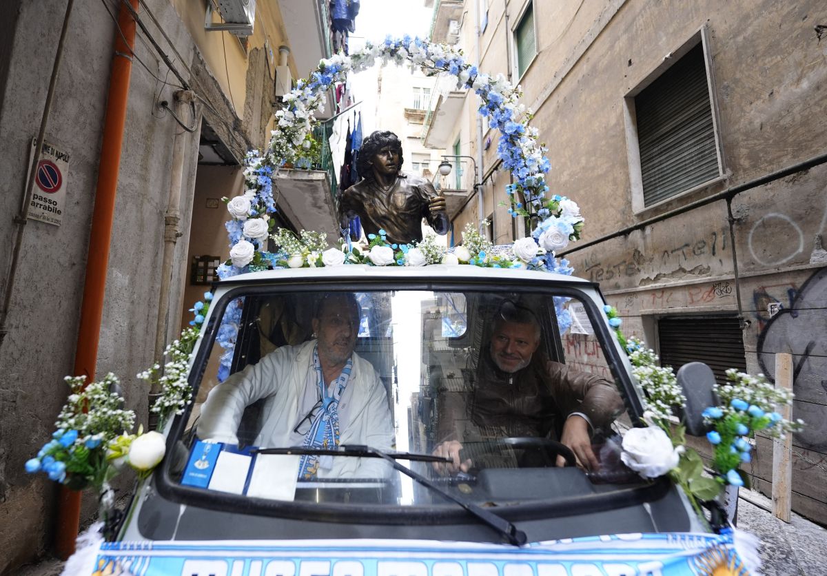 Το άγαλμά του θα κάνει συμβολική περιοδεία στους δρόμους της πόλης για 24 ώρες. Το χάλκινο έργο, δημιουργία του γλύπτη Dominic Sepe, που φυλάσσεται στο Μουσείο Συλλογής Vignati, θα διασχίσει μερικά από τα πιο εμβληματικά σημεία που συνδέουν τον Μαραντόνα με τη Νάπολη. Ένα συλλογικό δείγμα αγάπης που ανανεώνει κάθε χρόνο τον δεσμό μεταξύ της πόλης και της αιώνιας θρυλικής φιγούρας της.