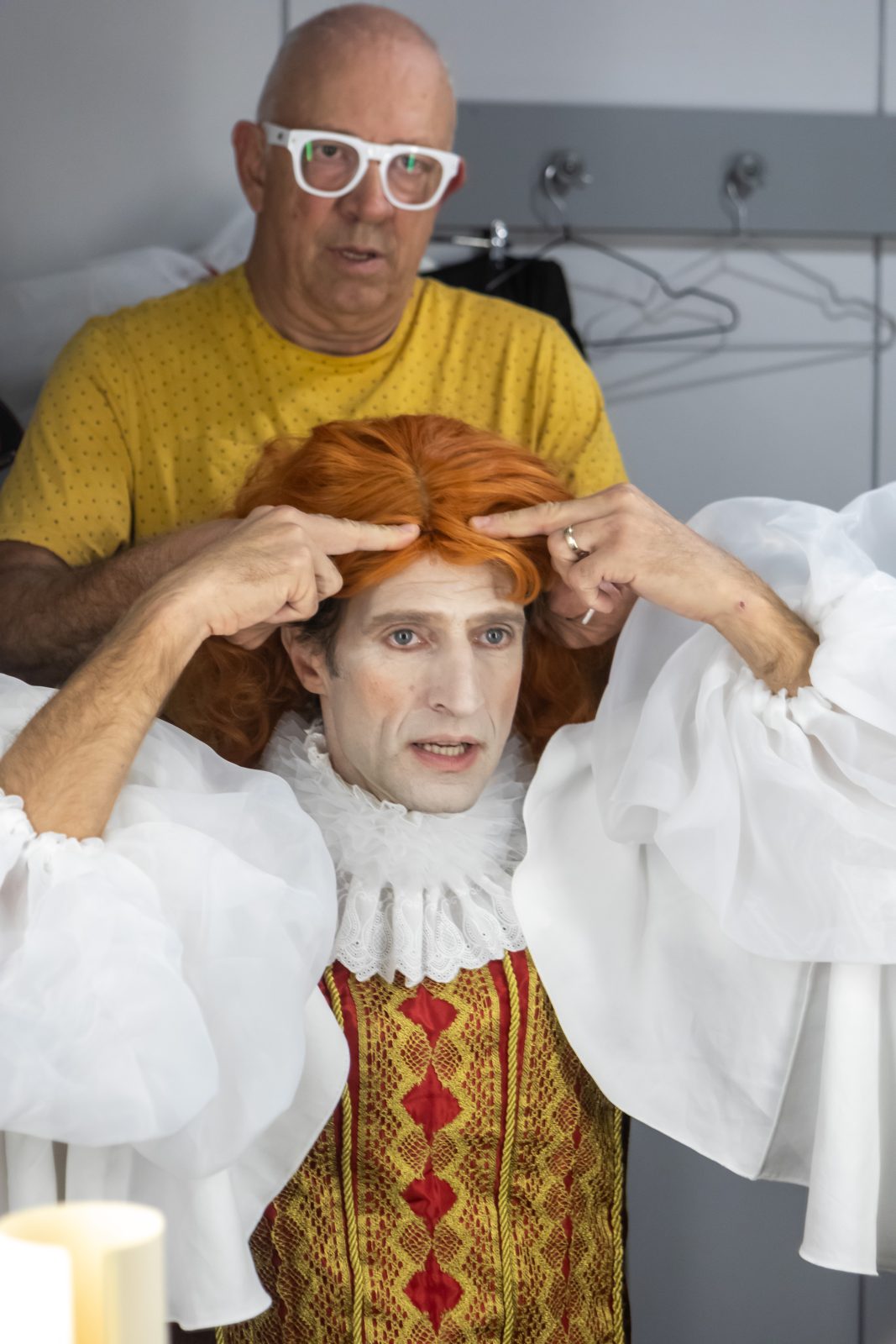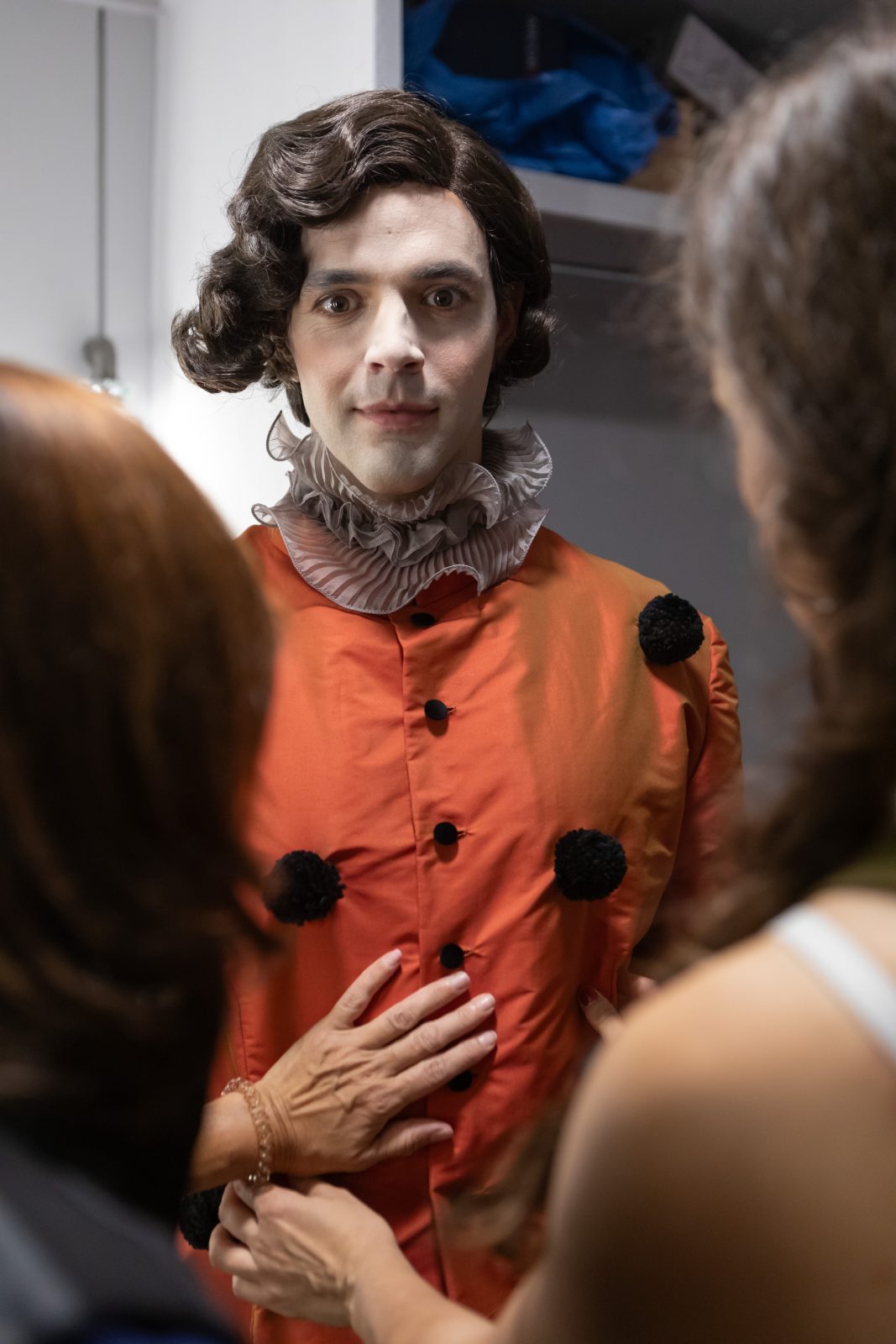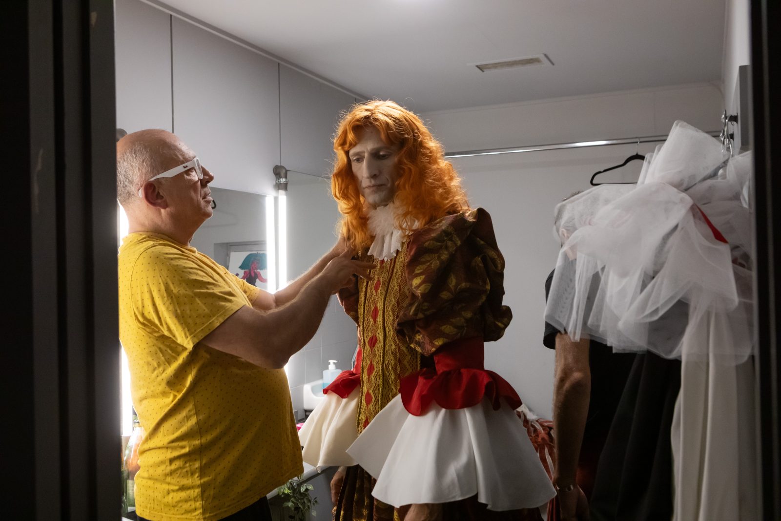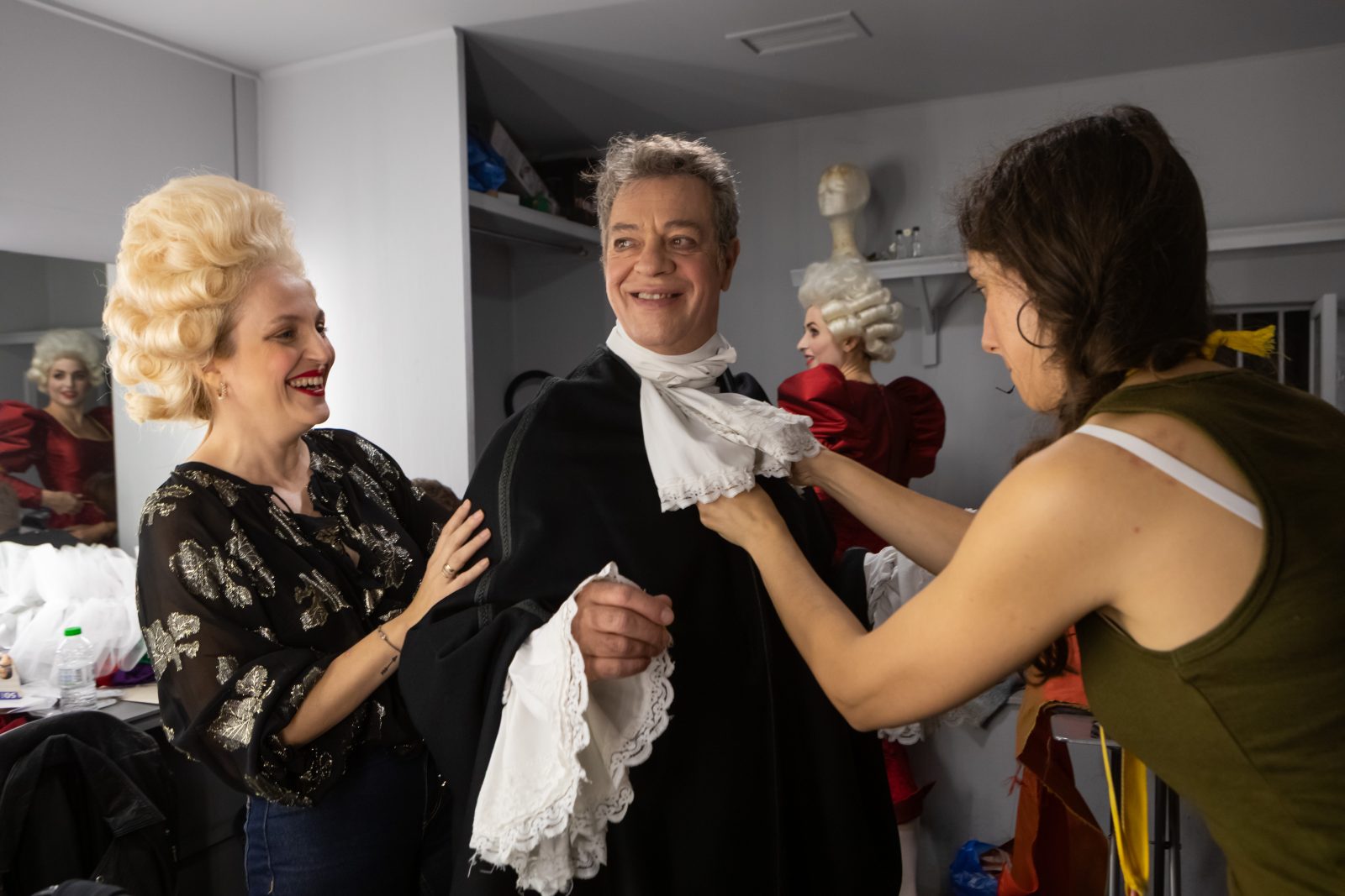 Κάποιοι ήταν ήδη έτοιμοι, ντυμένοι με τα ραμμένα sur-mesure ρούχα τους και περίμεναν στωικά τους ενδυματολόγους και τις μοδίστρες να ελέγξουν την κάθε λεπτομέρεια για τυχόν ατέλειες. Οι διορθώσεις γίνονταν επιτόπου κάτω από το έμπειρο βλέμμα του Πάρι Μέξη, υπεύθυνου για το σκηνικό και τα κοστούμια της παράστασης, ο οποίος παρενέβαινε όπου χρειαζόταν.