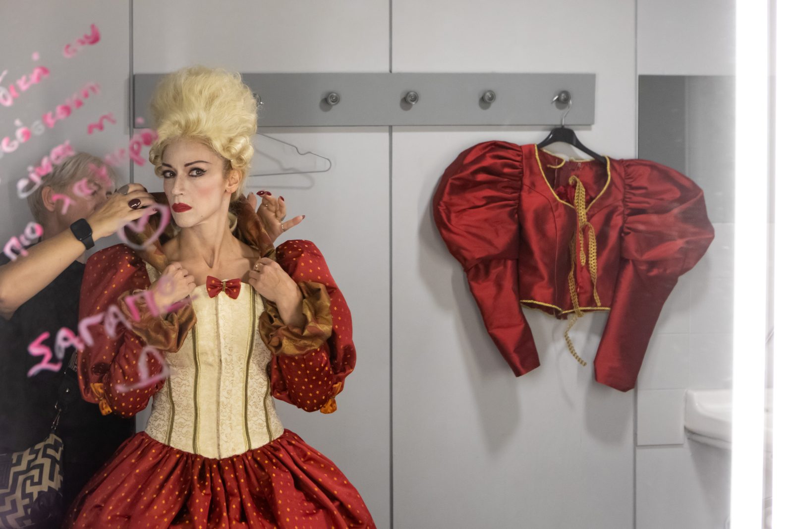 Στα καμαρίνια του θεάτρου τα φαντασμαγορικά κουστούμια, κρεμασμένα στη σειρά και οι πολύχρωμες περούκες, στερεωμένες στα κεφάλια των μανεκέν περίμεναν τους πρωταγωνιστές για να τα προβάρουν. Οι μακιγιέρ είχαν απλώσει τα σύνεργά τους στο μεγάλο τραπέζι του φουαγιέ και είχαν ήδη ξεκινήσει να βάφουν τους ηθοποιούς ανά ομάδες.