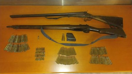 Σύμφωνα με ανακοίνωση της ΕΛΑΣ, από τις έρευνες, μεταξύ άλλων, βρέθηκαν και κατασχέθηκαν πολεμικό τυφέκιο με γεμιστήρα, δίκαννο, -2- καραμπίνες, από τις οποίες η μία χωρίς σειριακό αριθμό, -145- φυσίγγια και -9- μαχαίρια, τα οποία θα αποσταλούν για εργαστηριακή εξέταση.