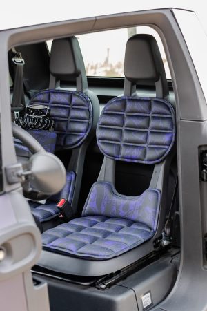 Στα ενδότερα ενδιαφέρον έχουν τα πλαστικά μέρη όπως τα πατάκια που κατασκευάζονται από ανακυκλωμένες στολές κατάδυσης και είναι προφανώς αδιάβροχα αλλά και το φορητό ντους ενώ υπάρχει μια μικρή θήκη στο τιμόνι και ένα μωβ φορητό ηχείο.