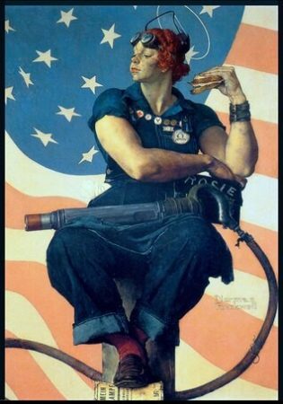 Ένα από τα πιο γνωστά, αλλά και πιο συχνά παρεξηγημένα έργα του Νόρμαν Ρόκγουελ είναι το «Rosie the Riveter» που δημοσιεύθηκε στο εξώφυλλο του Saturday Evening Post στις 29 Μαΐου 1943, κατά τη διάρκεια του Β΄ Παγκοσμίου Πολέμου. Απεικονίζει μια εργάτρια με στιβαρό παρουσιαστικό – τη Ρόζι – με μπλε φόρμα εργασίας στο μεσημεριανό της διάλειμμα. Καθισμένη μπροστά από την αμερικανική σημαία, κρατά τον εξοπλισμό της εργασίας της, με το πόδι της να πατά συμβολικά πάνω στο αυτοβιογραφικό βιβλίο του Αδόλφου Χίτλερ, «Ο Αγών μου».