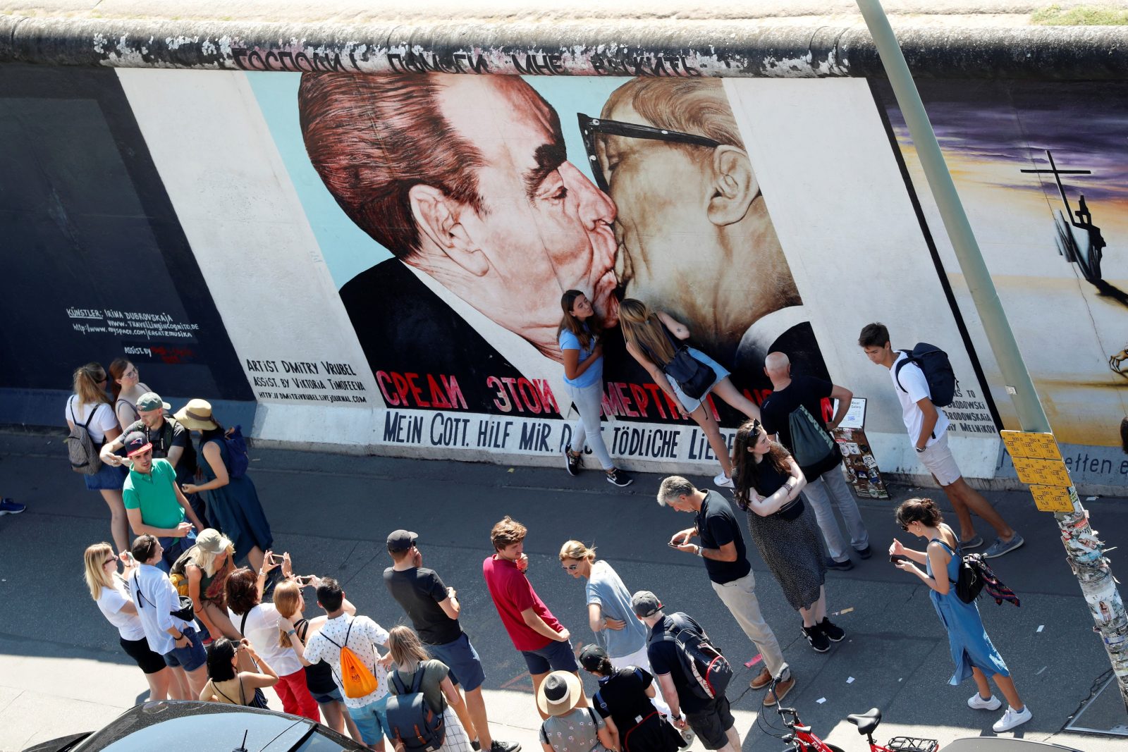Τουρίστες ποζάρουν μπροστά σε γκράφιτι που απεικονίζει τον πρώην Σοβιετικό ηγέτη Λεονίντ Μπρέζνιεφ να φιλά τον Ανατολικογερμανό ομόλογό του Έριχ Χόνεκερ, κατά μήκος της East Side Gallery, του μεγαλύτερου σωζόμενου τμήματος του πρώην Τείχους του Βερολίνου, στο Βερολίνο. Φωτογραφία τραβηγμένη στις 23 Αυγούστου 2019. Fabrizio Bensch / REUTERS