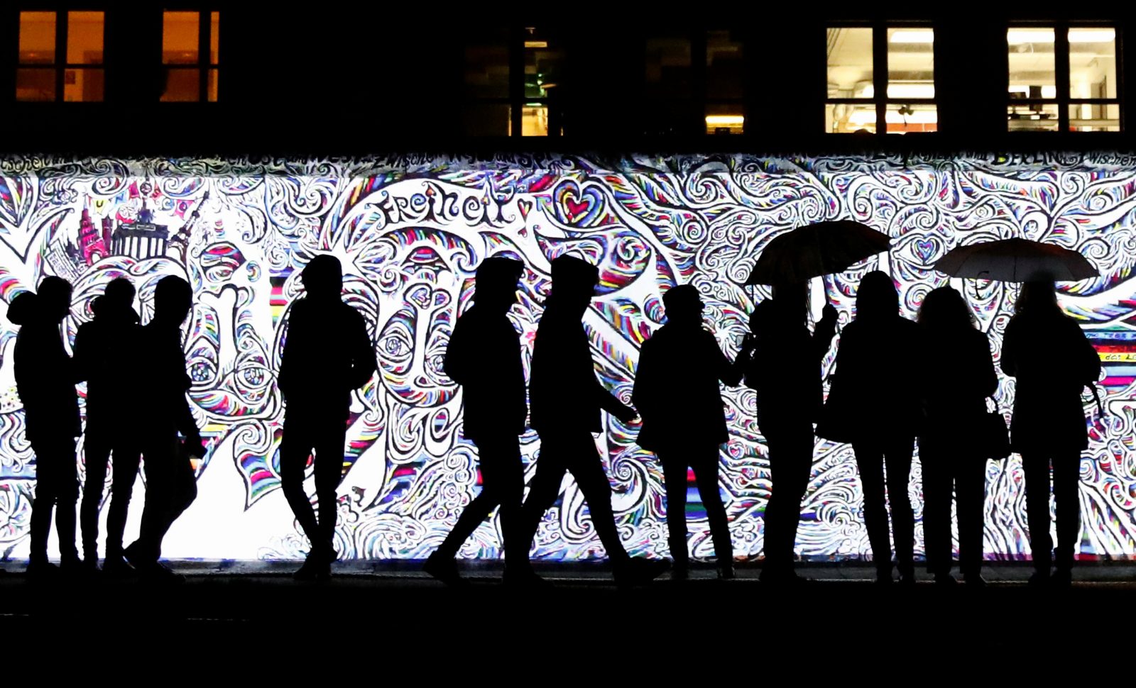 Άνθρωποι στέκονται μπροστά σε μια προβολή πάνω στην East Side Gallery, το μεγαλύτερο σωζόμενο τμήμα του πρώην Τείχους του Βερολίνου, στο Βερολίνο. Στις 9 Νοεμβρίου, η Γερμανία θα τιμήσει την 36ή επέτειο από την πτώση του Τείχους του Βερολίνου (Berliner Mauer) το 1989.
