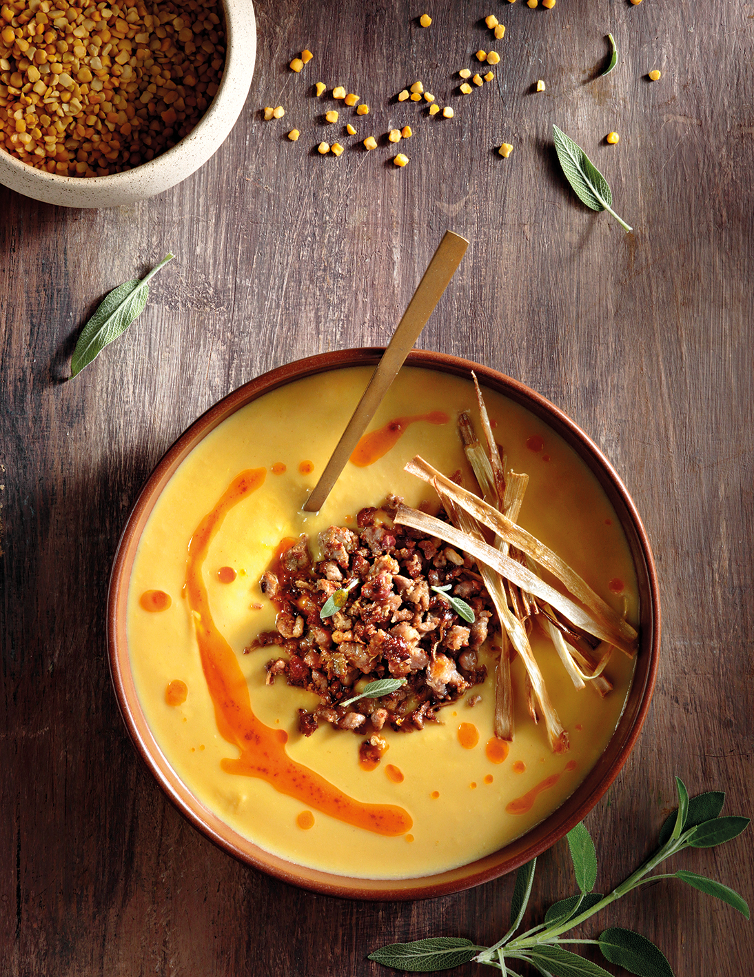 Βελουτέ φάβας με λουκάνικο και τηγανητό πράσο