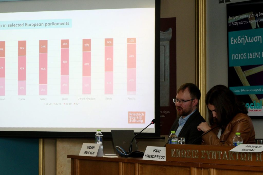 Στην ιδιότητα της δημοκρατίας ως μια ζωντανη διαδικασία συνεχώς εξελισσόμενη η οποία χρειάζεται διαρκώς ανανέωση και προσαρμογή στις κοινωνικές και ιστορικές συνθήκες, αναφέρθηκε ο συντονιστής του αντίστοιχου ευρωπαϊκού project για την σύνθεση των κοινοβουλίων των ευρωπαίκών χωρών, Michael Jennewein, επιστημονικός συνεργάτης του FES Αυστρίας, ο οποίος παρουσίασε ενδιαφέροντα στατιστικά από την ευρωπαίκή έρευνα που διεξάγεται σε άλλες 8 χώρες και όπως φάνηκε από τα στατιστικά αλλά και την ανάλυση των κινδύνων και των προκλήσεων η Ελλάδα δεν διαφοροποιείται αισθητά από τους ευρωπαϊκούς μέσους όρους.