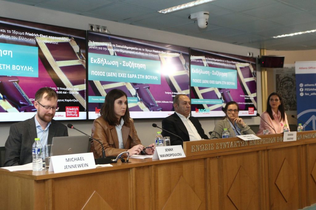 Ηλικιωμένοι άνδρες, υψηλού μορφωτικού και κοινωνικοοικονομικού επιπέδου, αποτελούν τη συντριπτική πλειονότητα της σημερινής ελληνικής Βουλής, σύμφωνα με τα αποκαλυπτικά ευρήματα της μελέτης του Ινστιτούτου Friedrich Ebert Stiftung «Ελλάδα: Ποιος (δεν) έχει έδρα στη Βουλή;», που πραγματοποίησε η Τζένη Μαυροπούλου, υποψήφια διδάκτωρ του Τμήματος Πολιτικής Επιστήμης και Ιστορίας του Παντείου Πανεπιστημίου και παρουσιάστηκε σε εκδήλωση που συνδιοργάνωσαν το Ινστιτούτο για τη Σοσιαλδημοκρατία – InSocial και το Friedrich Ebert Stiftung – Αθήνας, στην ΕΣΗΕΑ, με συντονιστή τον δημοσιογράφο Μιχάλη Μιχαήλ, στην οποία απηύθηναν χαιρετισμό οι διευθυντές των δύο ινστιτούτων, Regine Shubert του FES και Γιώργος Παπούλιας του InSocial.