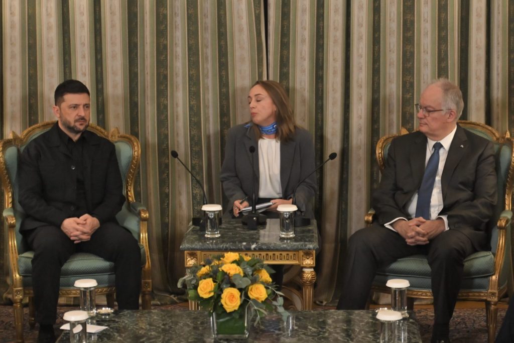 Λίγη ώρα αργότερα, ο κ. Ζελένσκι έφτασε στο Προεδρικό Μέγαρο, όπου είχε ήδη παραταχθεί η φρουρά του Ουκρανού προέδρου εν αναμονή της άφιξής του. Ο Ουκρανός ηγέτης πέρασε την πύλη του Μεγάρου, όπου τον υποδέχτηκε ο Πρόεδρος της Δημοκρατίας, Κωνσταντίνος Τασούλας.