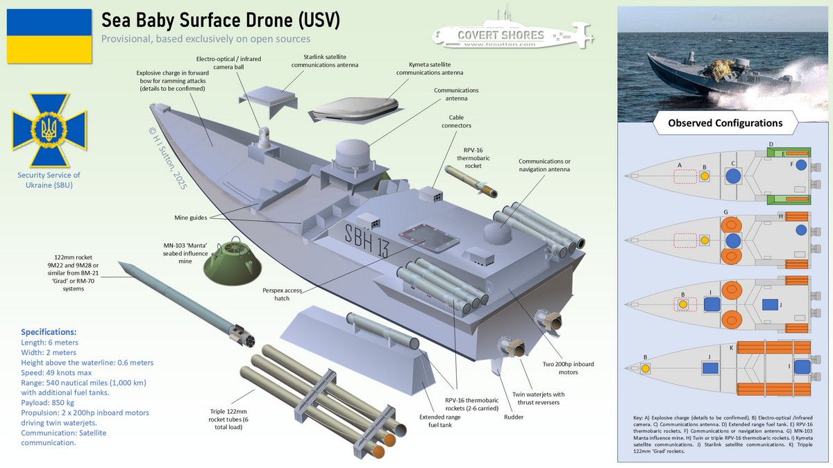 Πριν από περίπου ένα μήνα η Υπηρεσία Ασφαλείας της Ουκρανίας (SBU) παρουσίασε την τελευταία έκδοση του ναυτικού drone «sea baby». Η συγκεκριμένη έκδοση, σε σχέση με την προηγούμενη, παρέχει μεγαλύτερη αυτονομία.