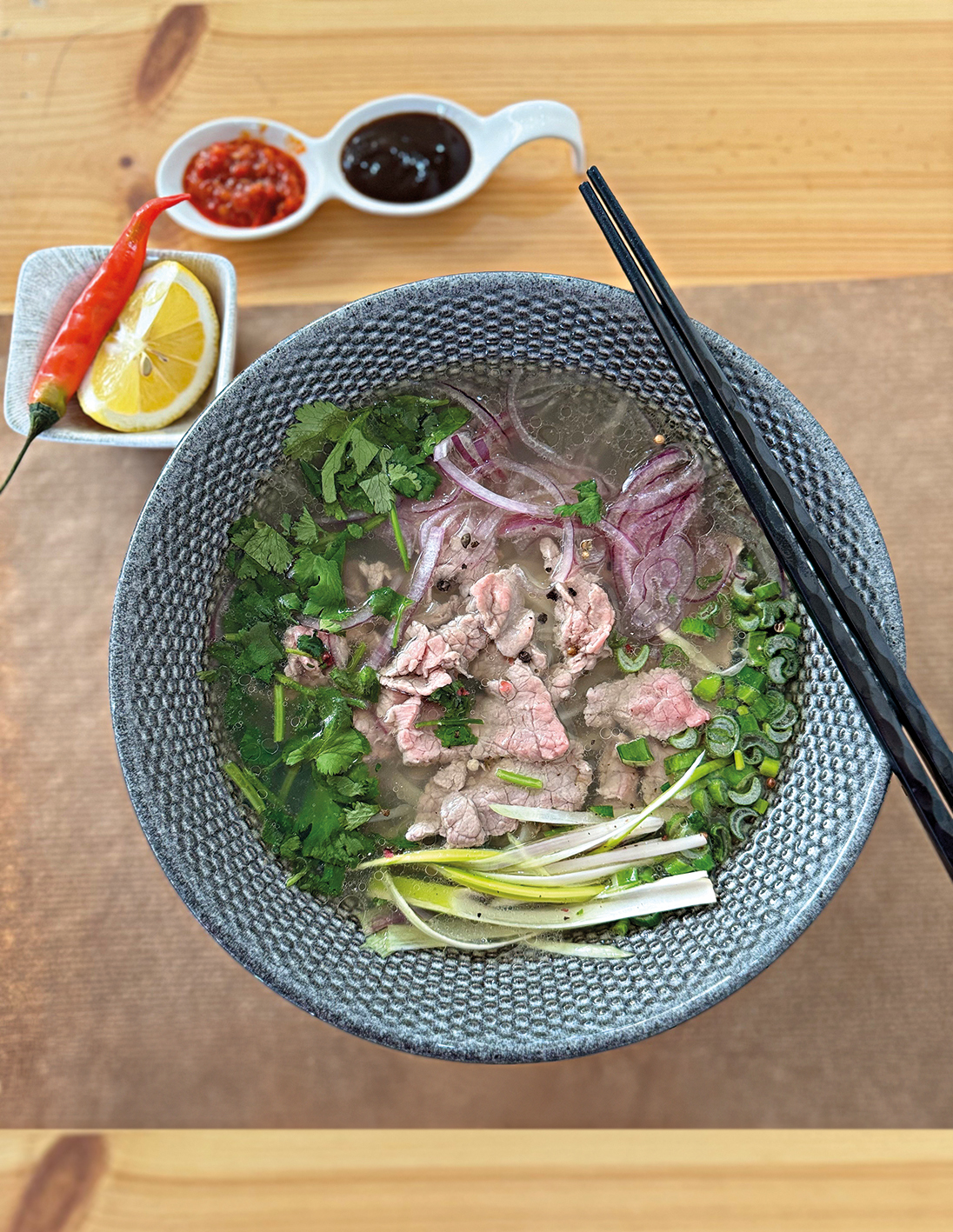 Λίγα λοιπόν τα βιετναμέζικα εστιατόρια στην Αθήνα, αλλά ευτυχώς ποιοτικά. Θα συμφωνήσουν και οι ουρές πεινασμένων πελατών που περιμένουν έξω από το Hanoi για να απολαύσουν τα πιάτα του. Pho λοιπόν και πάλι, στο Σύνταγμα αυτήν τη φορά, σε ένα μικρό, ανεπιτήδευτο μαγαζί που έχει γίνει στέκι. Ο ζωμός βράζει τουλάχιστον δώδεκα ώρες με μοσχαρίσια κόκαλα, καψαλισμένα κρεμμύδια, τζίντζερ, γλυκάνισο και κανέλα. Στο μπολ προστίθενται τα κλασικά υλικά, νουντλ ρυζιού, λεπτοκομμένο κρέας, φρέσκο κόλιαντρο. Δίπλα, λάιμ και τσίλι για τους «περιπετειώδεις» ουρανίσκους. Αν καταφέρετε να φτάσετε στην αρχή της ουράς, μη χάσετε την ευκαιρία να δοκιμάσετε και τα υπόλοιπα πιάτα του καταλόγου. Δεν θα απογοητευτείτε. Ούτε εσείς ούτε η τσέπη σας.