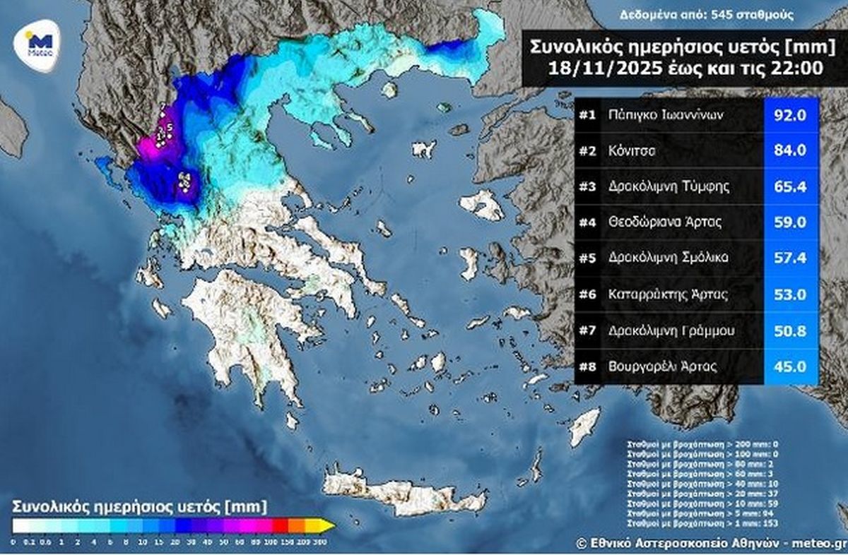 Σύμφωνα με το δίκτυο αυτόματων μετεωρολογικών σταθμών του Εθνικού Αστεροσκοπείου Αθηνών/Meteo.gr τα μεγαλύτερα ύψη βροχής, όπως αποτυπώνεται στη χρωματική κλίματα του χάρτη, με το μεγαλύτερο ύψος βροχής μέχρι και τις 22:00 ώρα Ελλάδας να καταγράφεται στο Πάπιγκο Ιωαννίνων με 92.0 mm.
