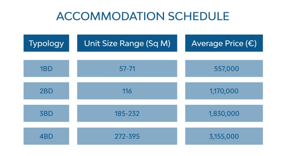 Οι τιμές αγοράς ξεκινούν από €485.000 και φτάνουν έως τα €4,5 εκατ., ενώ οι τιμές ανά τ.μ. κυμαίνονται μεταξύ €6.985 και €12.500, ανάλογα με το κτίριο και την τυπολογία. Το έργο προσφέρει ένα προσεκτικά επιλεγμένο φάσμα διαμερισμάτων, όπως παρουσιάζεται στον εγκεκριμένο πίνακα τυπολογιών: