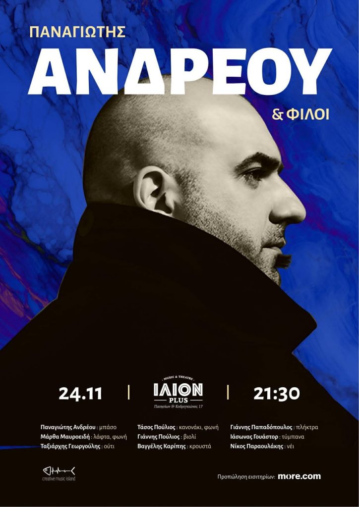 Μια ενδιαφέρουσα σύμπραξη τζαζ και ανατολικής μουσικής αποτελεί η συνεργασία του μπασίστα Παναγιώτη Ανδρέου με μια ομάδα ξεχωριστών μουσικών όπως η Μάρθα Μαυροειδή, ηλεκτρική λάφτα & φωνή, ο Τάσος Πούλιος, κανονάκι & φωνή, ο Ταξιάρχης Γεωργούλης, ούτι, ο Γιάννης Παπαδόπουλος, πλήκτρα, ο Ιάσονας Γουάστωρ, τύμπανα, ο Βαγγέλης Καρίπης, κρουστά, ο Νίκος Παραουλάκης, νέι και ο Γιάννης Πούλιος, βιολί. Η μουσική συνάντηση «Παναγιώτης Ανδρέου & φίλοι» θα λάβει χώρα την Δευτέρα 24 Νοεμβρίου, στις 21:30, στο Ίλιον plus (Πατησίων & Κοδριγκτώνος 17).