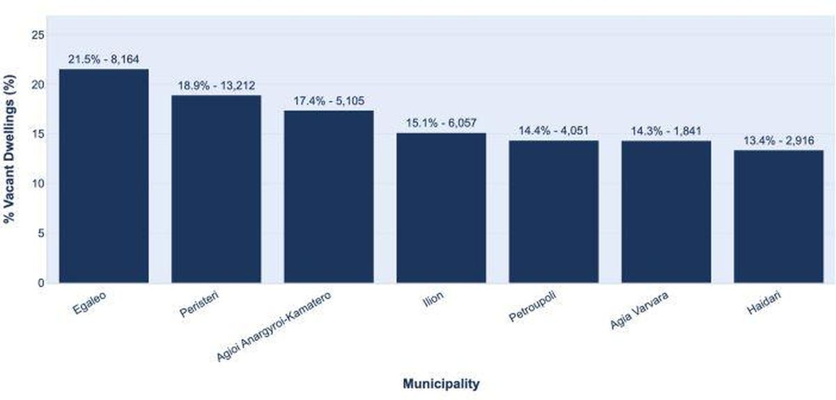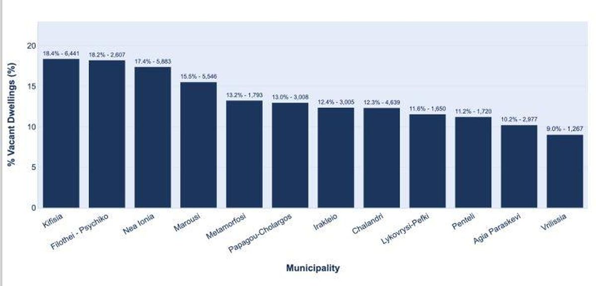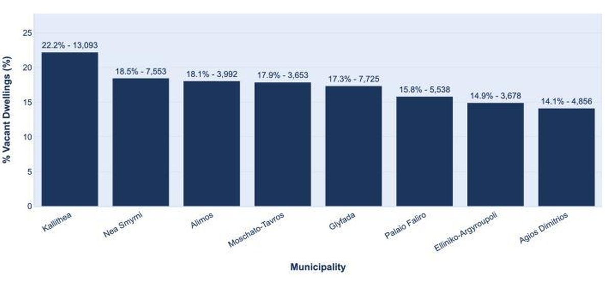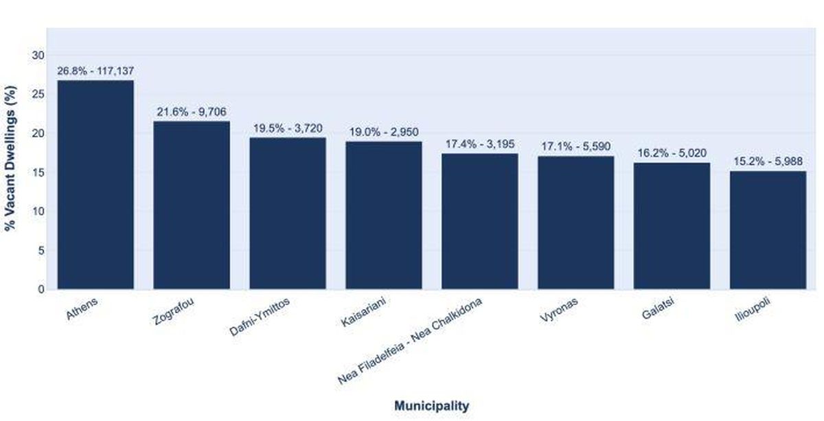 Σχεδόν 120.000 είναι οι κενές κατοικίες στην Αθήνα, περίπου όσο ο συνολικός αριθμός όλων των κατοικιών στην Πάτρα, που αποτελεί τον τέταρτο μεγαλύτερο δήμο της Ελλάδας. Πολύ υψηλά ποσοστά παρατηρούνται επίσης και σε άλλες περιοχές της Αττικής, ειδικά στον Πειραιά, αλλά και στους νότιους και δυτικούς δήμους του λεκανοπεδίου, όπου υπάρχει και μεγαλύτερη συγκέντρωση κατοικιών.