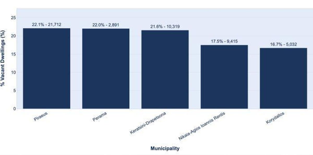 Τα ποσοστά κενών θέσεων στην περιοχή του Πειραιά είναι σταθερά υψηλά, κυμαίνονται μεταξύ 17% και 22%. Τα περισσότερα κλειστά διαμερίσματα έιναι στον Πειραιά με 22,1% ή 21.172 και το Πέραμα με 22% ενώ πιο χαμηλά είναι ο Κορυδαλλός με 16,7%.