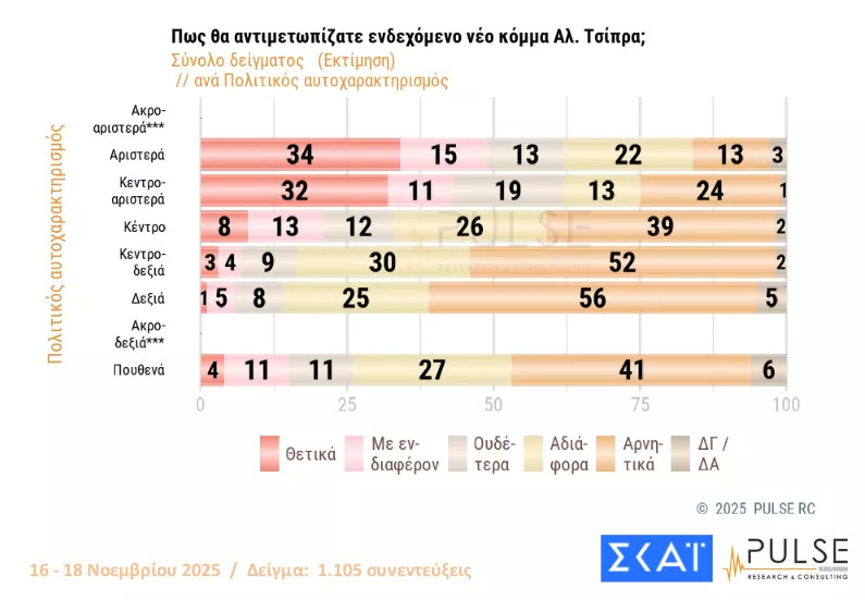 Άνοδο τριών μονάδων σε σχέση με τον προηγούμενο μήνα εμφανίζουν οι θετικές γνώμες για ένα «κόμμα Τσίπρα» – ανεβαίνουν στο 14% από 11% τον Οκτώβριο. Στους αυτοχαρακτηριζόμενους ως «αριστεροί» και «κεντροαριστεροί» , οι θετικές γνώμες είναι πάνω από 30% – και πέφτουν στο 8% στους ψηφοφόρους του Κέντρου.