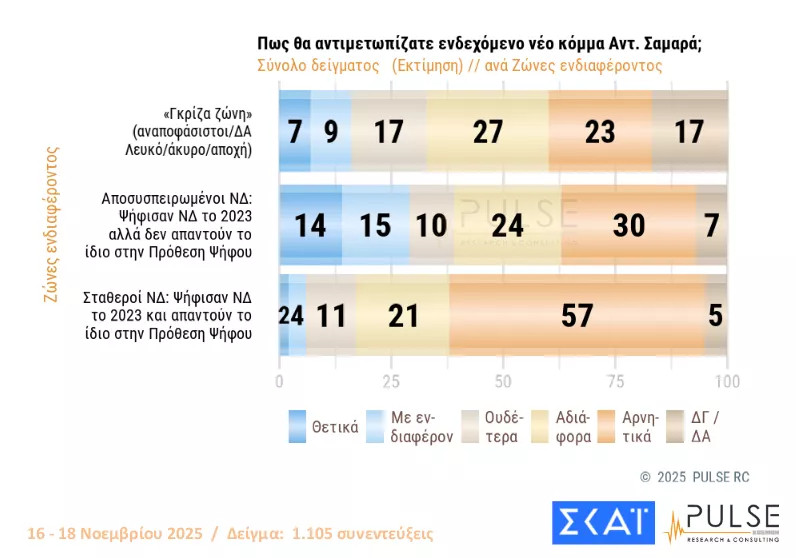 Μικρή άνοδο – από το 5% στο 6% – εμφανίζουν οι θετικές γνώμες για ένα «κόμμα Σαμαρά», που δείχνει να έχει μεγαλύτερη πρόσβαση στους αποσυσπειρωμένους ψηφοφόρους της ΝΔ – αυτούς δηλαδή που ψήφισαν το κυβερνών κόμμα το 2023 αλλά δεν απαντούν το ίδιο σήμερα στην πρόθεση ψήφου.
