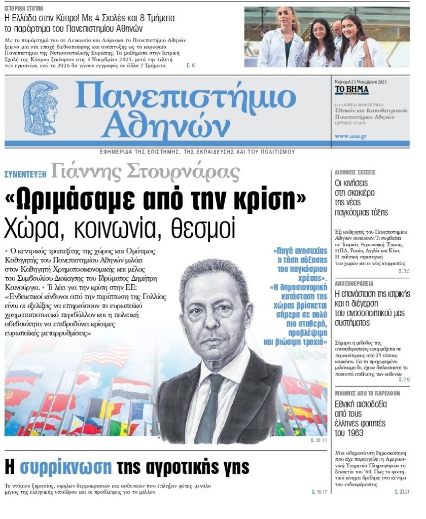 Την Κυριακή 23 Νοεμβρίου, το Πανεπιστήμιο Αθηνών κυκλοφορεί με το «Βήμα της Κυριακής» το πέμπτο φύλλο της εφημερίδας του υπό τον τίτλο «Πανεπιστήμιο Αθηνών, Εφημερίδα της Επιστήμης, της Εκπαίδευσης και του Πολιτισμού».