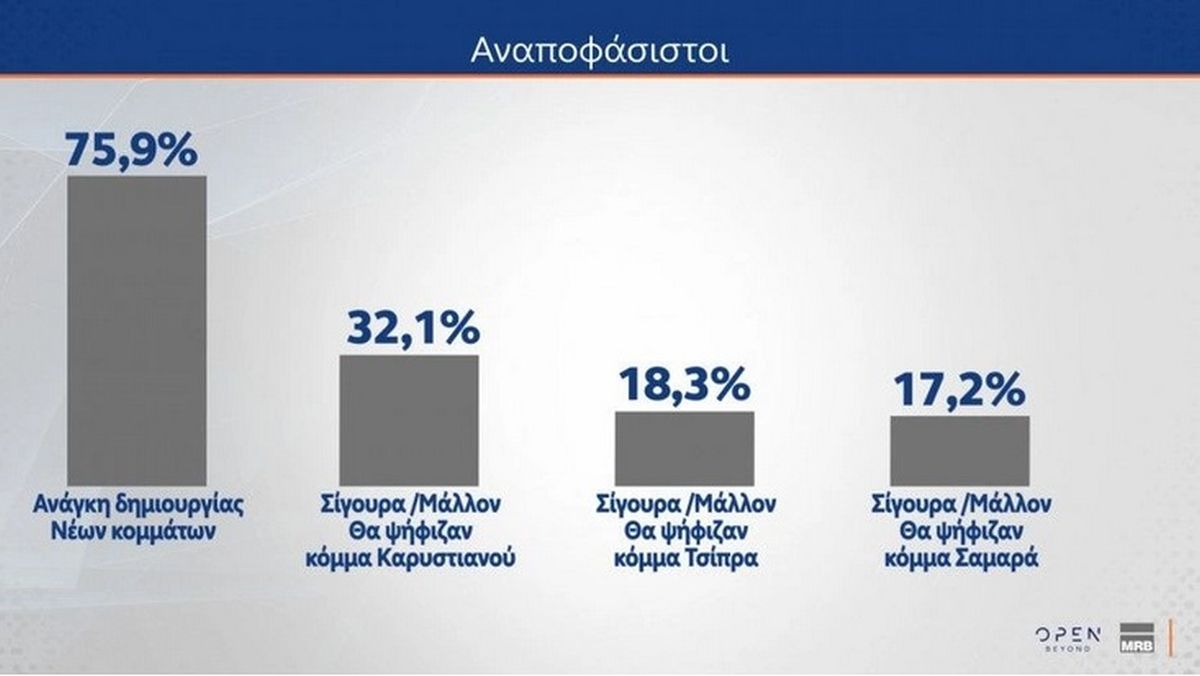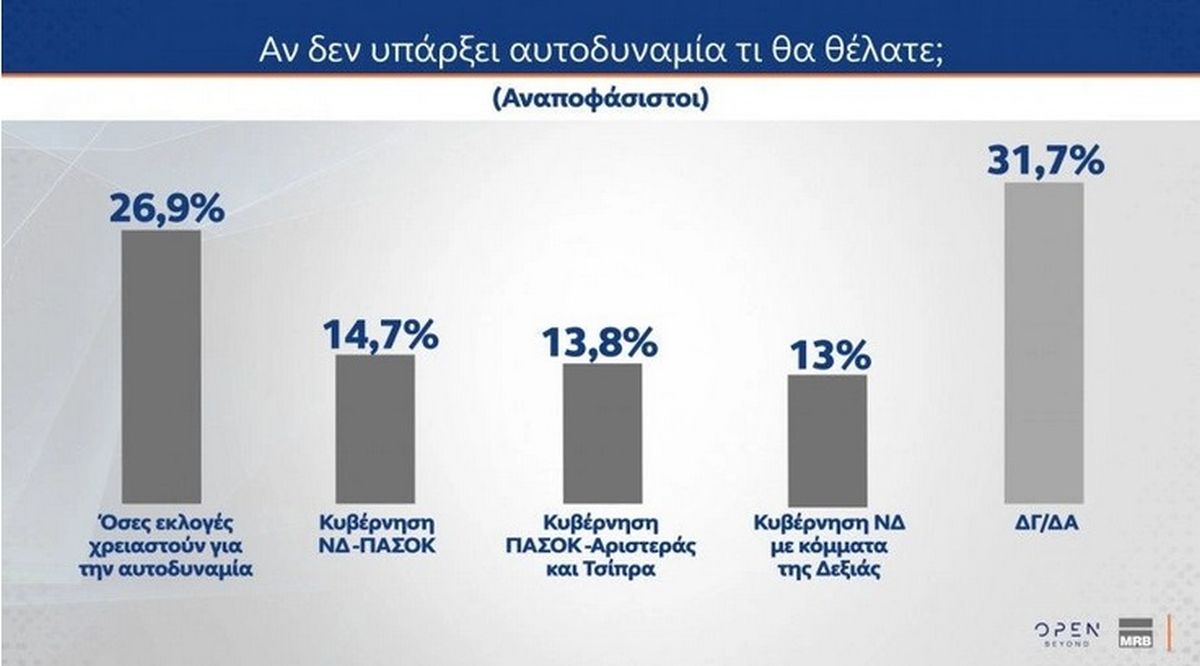 Στο ενδεχόμενο να μην υπάρξει αυτοδυναμία στις επόμενες εκλογές, το 26,9% των αναποφάσιστων της έρευνας απαντά να γίνουν όσες εκλογές χρειαστούν.