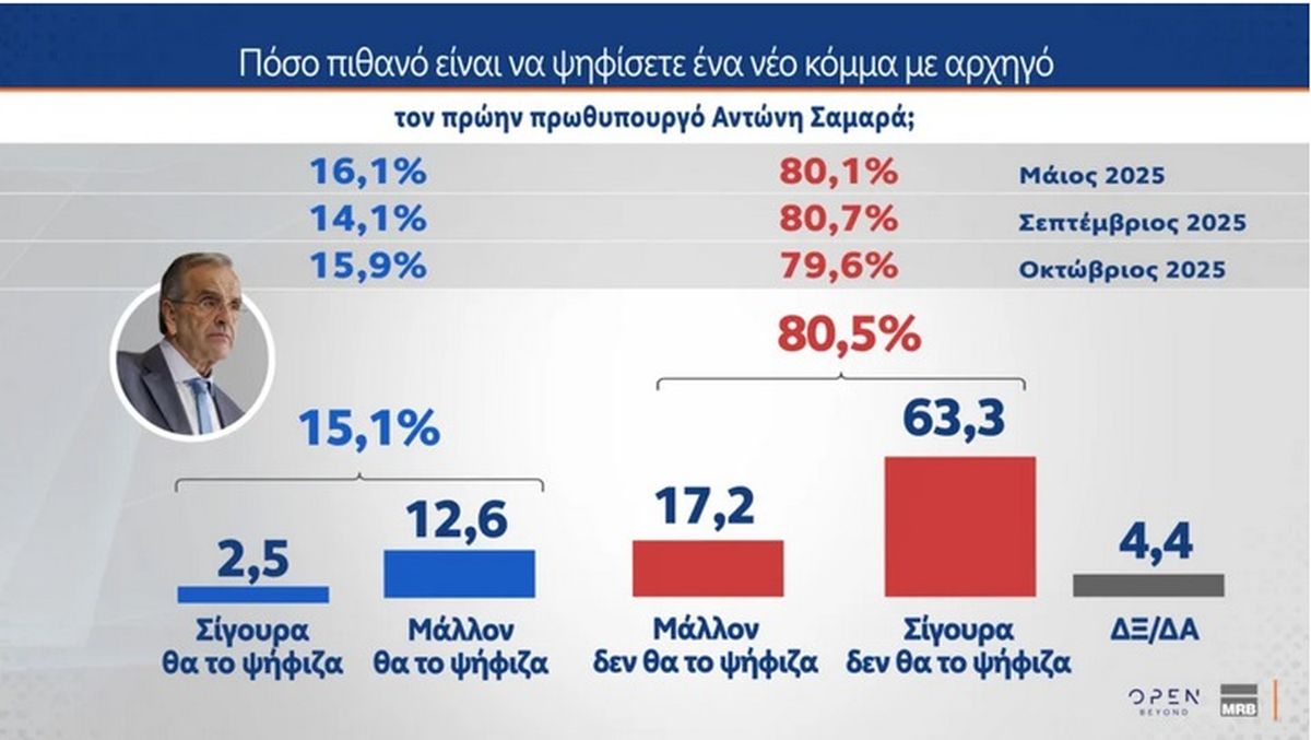 Στο ενδεχόμενο δημιουργίας νέου κόμματος υπό τον Αντώνη Σαμαρά, οι θετικές απαντήσεις είναι στο 15,1% έναντι 63,3%.