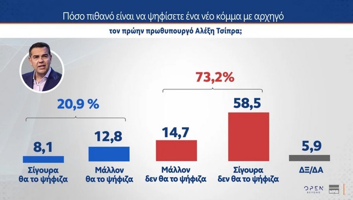Το 20,9% των συμμετεχόντων δηλώνει ότι θα ψήφιζε ένα νέο κόμμα με αρχηγό τον Αλέξη Τσίπρα, ενώ το 73,2% απαντά αρνητικά.