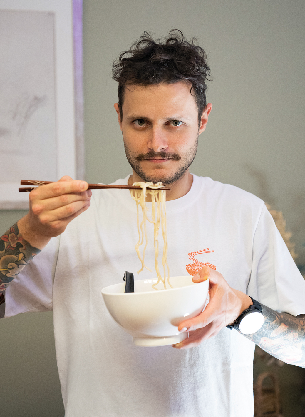 Με σεβασμό στην ιαπωνική παράδοση αλλά και με την ανήσυχη διάθεση ενός δημιουργού που θέλει να εξελίσσεται, αποφάσισε να κάνει το επόμενο βήμα. Και το έκανε έξυπνα: έγινε ο πρώτος στην Ελλάδα που δημιούργησε εργαστήριο φρέσκων ramen noodles και udon, αφιερωμένο αποκλειστικά στην τέχνη της ζύμης και της υφής. Μια μικρή «βιοτεχνία» γεύσης, φτιαγμένη με χειροποίητη ακρίβεια και απόλυτο σεβασμό στην παράδοση.