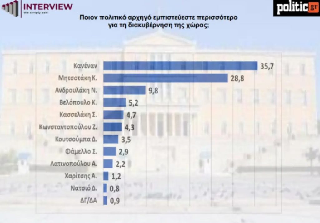Στο ερώτημα εμπιστοσύνης προς τους πολιτικούς αρχηγούς, η επιλογή «Κανένας» ενισχύεται και φτάνει στο 35,7%, από 32,3% τον προηγούμενο μήνα.
