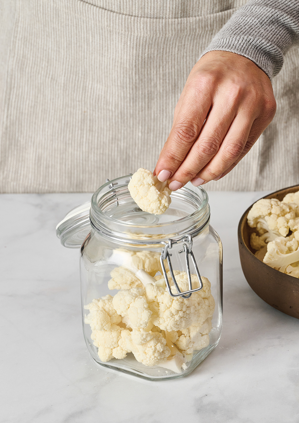 4. Τοποθετούμε στο βάζο τις φουντίτσες του κουνουπιδιού, έτσι ώστε να πάνε παντού ομοιόμορφα.