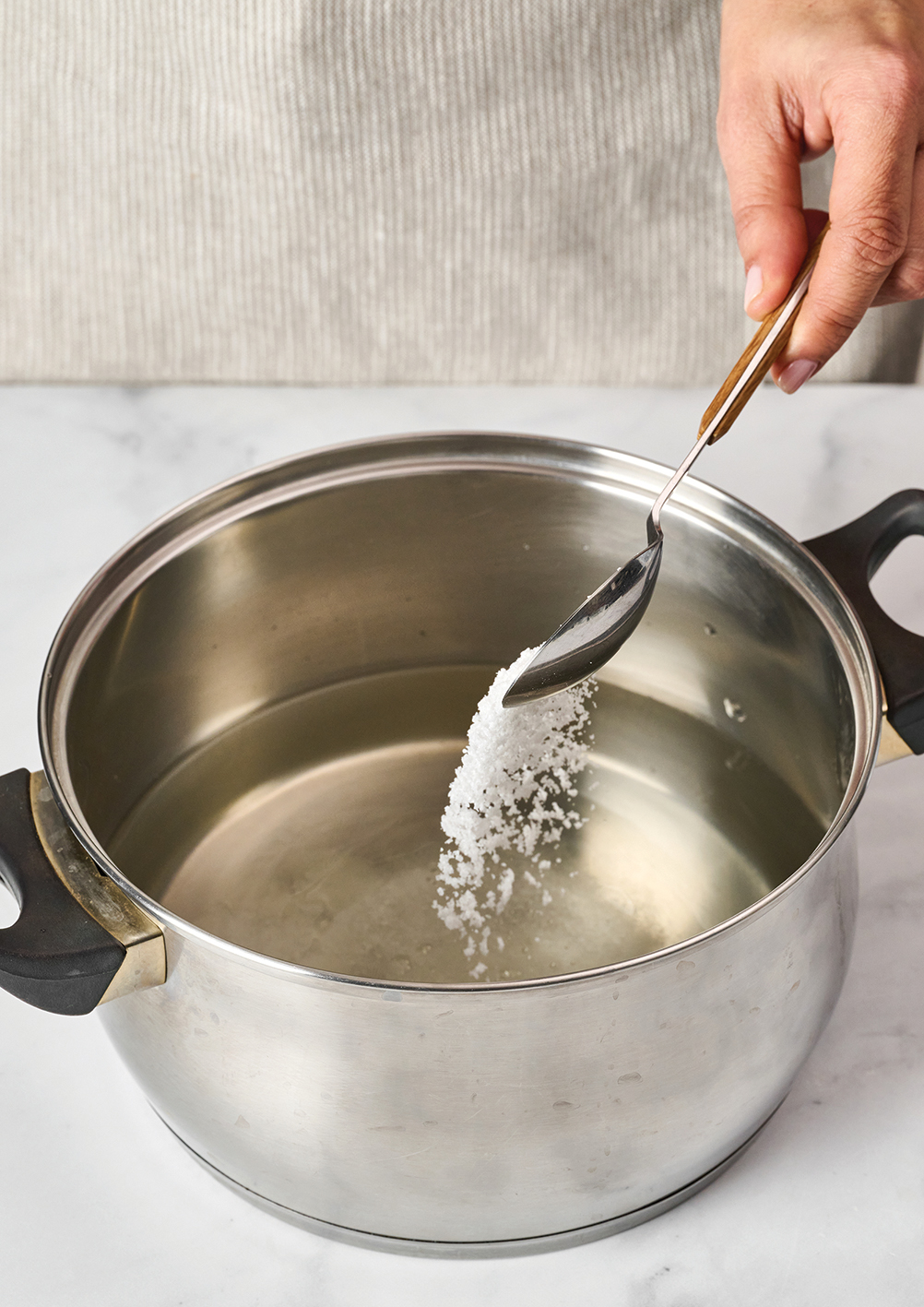 2. Προσθέτουμε στην κατσαρόλα 1½ κ.σ. ψιλό αλάτι και 3½ κ.σ. ζάχαρη και αρχίζουμε να ζεσταίνουμε το μείγμα σε μέτρια φωτιά.