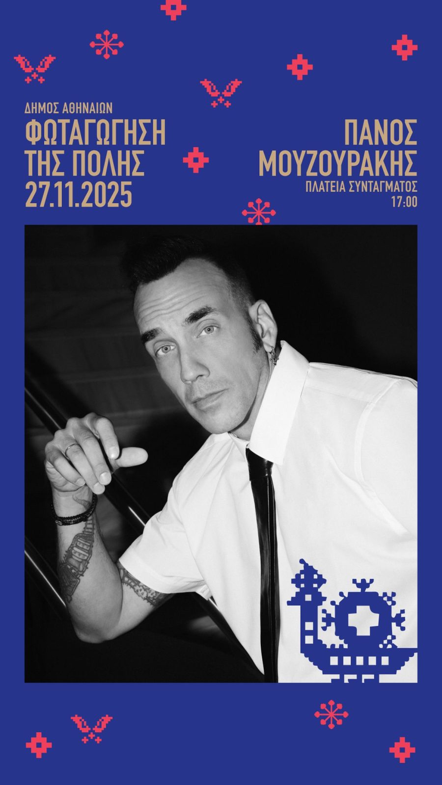 Ο Πάνος Μουζουράκης θα παρουσιάσει από τις 18:30 έως τις 20:30, ένα εντυπωσιακό χριστουγεννιάτικο live show, ειδικά διαμορφωμένο για τη γιορτινή βραδιά. Με αγαπημένες επιτυχίες, όπως «Μεγαλώνω», «Έπαθα Αγάπη», «Αυτή Είναι Η Ζωή», «Φίλα Με Ακόμα», «Μαντάμ», καθώς και με ιδιαίτερες διασκευές, ο ανατρεπτικός ερμηνευτής και performer υπόσχεται μια συναυλία γεμάτη συναίσθημα, κέφι και χριστουγεννιάτικη διάθεση.