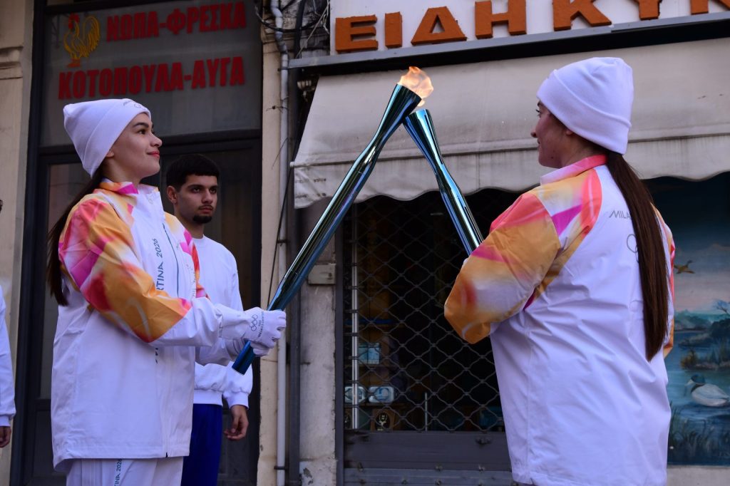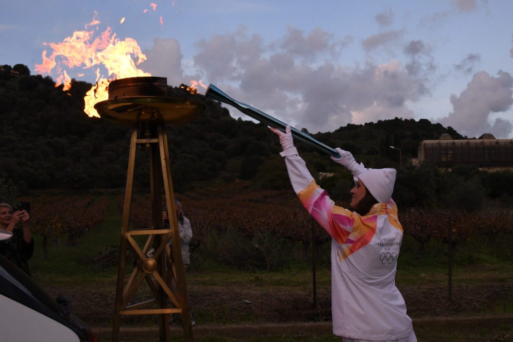 Ο λαμπαδηδρόμος, φορώντας την επίσημη στολή, ύψωσε τη δάδα και άναψε τη μεγάλη φλόγα στον τελετουργικό βωμό που είχε στηθεί μπροστά από το ιστορικό κτίριο, ενώ γύρω του βρίσκονταν στελέχη της Ελληνικής Ολυμπιακής Επιτροπής, αθλητές και εθελοντές σε παραδοσιακές ενδυμασίες.