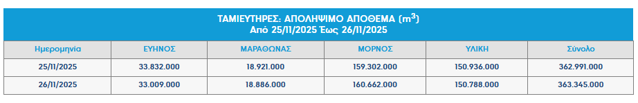 Αντίστοιχα, τα συνολικά αποθέματα στους τέσσερις κύριους ταμιευτήρες (Εύηνος, Μόρνος, Υλίκη, Μαραθώνας) υποχώρησαν στα 363,3 εκατ. κ.μ. από 571,0 εκατ. κ.μ. το 2024, σημειώνοντας μείωση 37%.