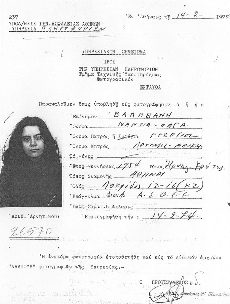 Το έγγραφο συντάσσεται το 1976 –επί υπουργίας στο Δημόσιας Τάξης του Σόλωνα Γκίκα- και περιλαμβάνει 117 άτομα, 15 κορίτσια, 112 αγόρια, με τα ονόματα –μικρά ή και τα επίθετα– συχνά άγρια κακοποιημένα, όπως σχολιάζει η κυρία Βαλαβάνη. Π.χ. η Μαρία Δαμανάκη πρέπει να έχει περαστεί δυο φορές, και τις δύο λάθος, τη μία ως Αμανάκη Μαρία, τη δεύτερη ως Δαμιανάκη Μαρία, ο συγγραφέας, κριτικός και δημοσιογράφος Θανάσης Γιαλκέτσης εμφανίζεται διπλός ως Γιαλικιώτης Αθανάσιος, ο δε Βοντικός Δημήτριος δεν είναι παρά το alter-ego του Δημήτρη Γόντικα, ιστορικού γραμματέα της μαζικής ΚΝΕ της μεταπολίτευσης μέχρι το 1979 και σκληρά βασανισμένου στην χούντα.