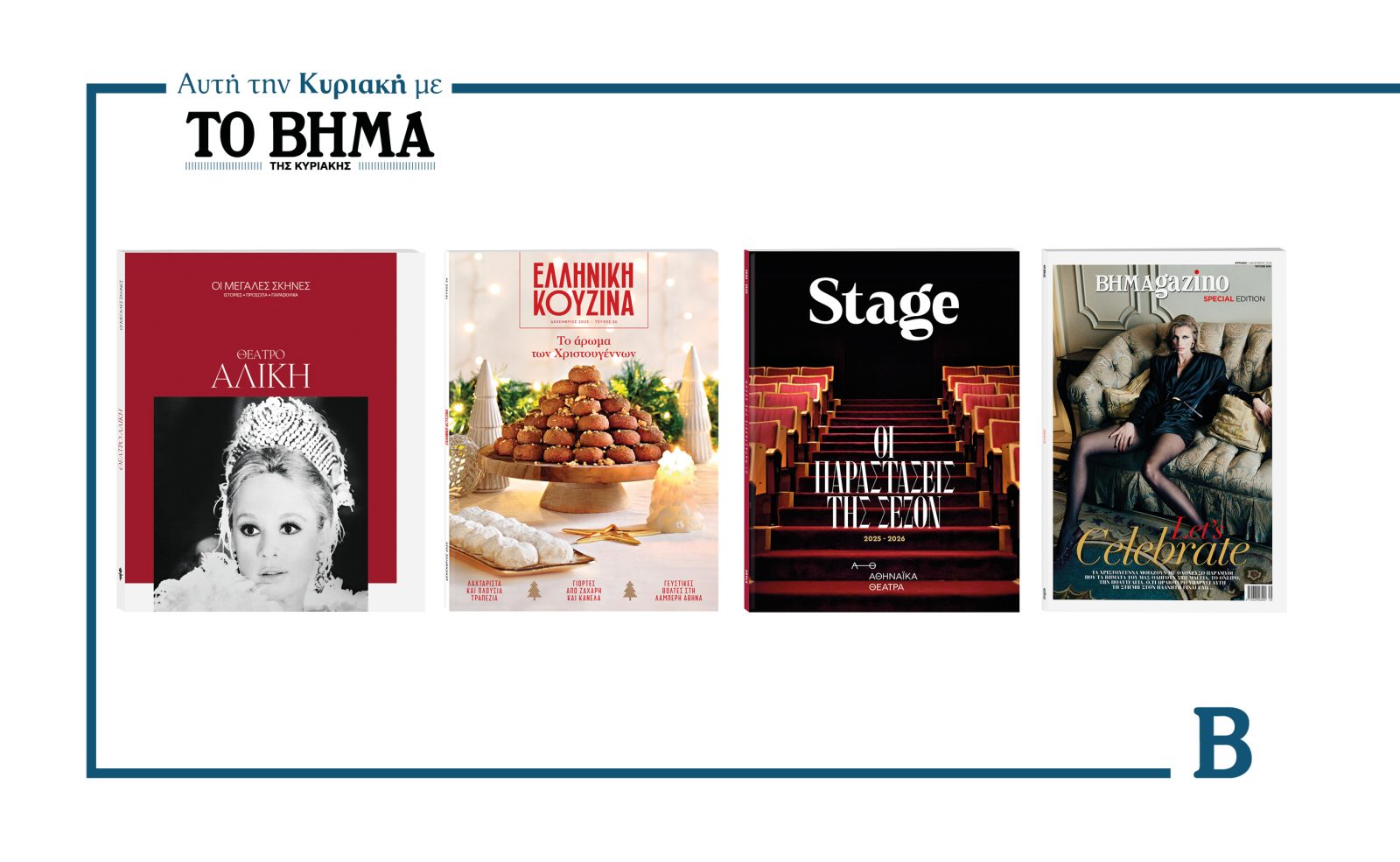 Την Κυριακή 7 Δεκεμβρίου το «Βήμα της Κυριακής» κυκλοφορεί με συναρπαστικές προσφορές: Οι Μεγάλες Σκηνές που παρουσιάζουν το Θέατρο Αλίκη, το περιοδικό Ελληνική Κουζίνα, το περιοδικό STAGE με τις παραστάσεις της σεζόν, και όπως κάθε Κυριακή το ΒΗΜΑGAZINO.