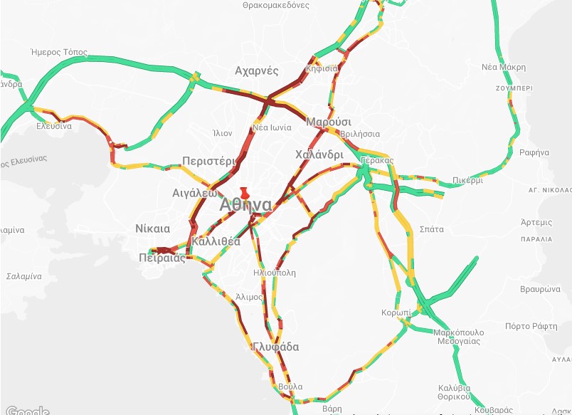 Ο Κηφισός βρίσκεται στο «κόκκινο» από το Μοσχάτο έως την Μεταμόρφωση, ενώ σημαντικές καθυστερήσεις παρατηρούνται και σε άλλες οδικές αρτηρίες.