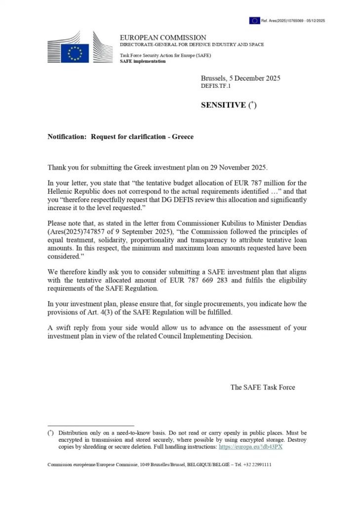 Αναλυτικά η επιστολή απάντησης της Ευρωπαϊκής Επιτροπής προς της χώρα μας: «Σας ευχαριστούμε για την υποβολή του ελληνικού επενδυτικού σχεδίου στις 29 Νοεμβρίου 2025.
